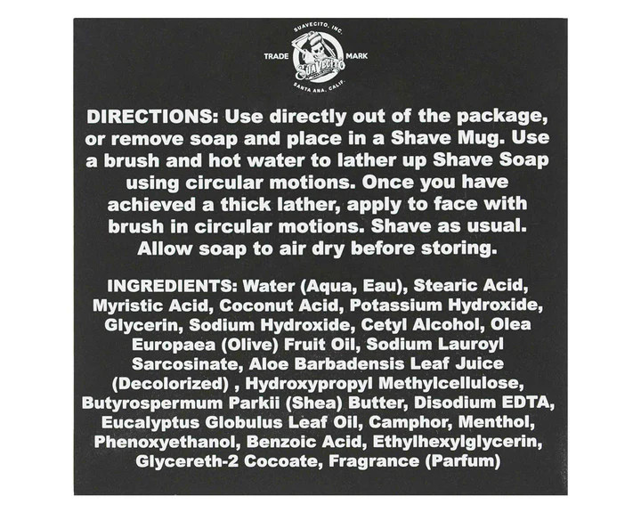 Directions: Use directly from the package, or place in a shave mug. With a brush and hot water, lather the soap in circular motions until thick and creamy. Apply to the face with circular brush strokes and shave as usual. Allow soap to air dry before storing.